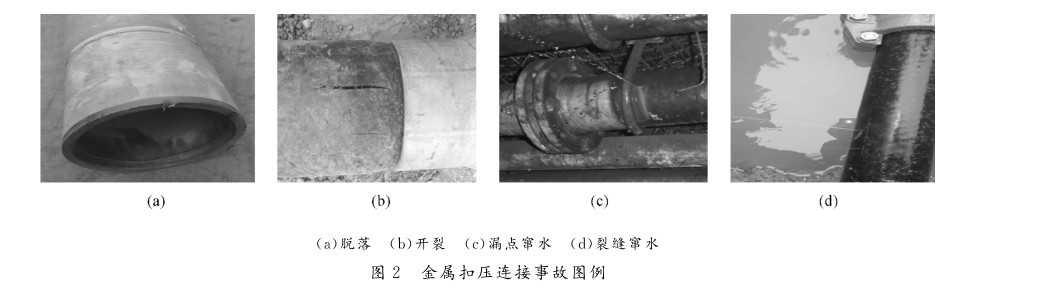 鋼(gāng)絲(sī)網骨(gǔ)架聚乙烯複合管采用金屬扣壓連接可以滿足3.5MPa以內的連接技術要求。但這種連接在承壓(yā)能力較高時,長期穩定性較差,易(yì)發生管道係統金屬扣壓接(jiē)頭脫落(luò)、竄水、竄氣等問題,見圖2。