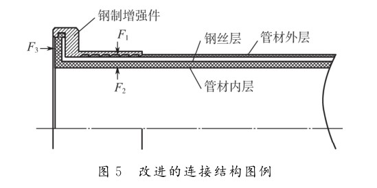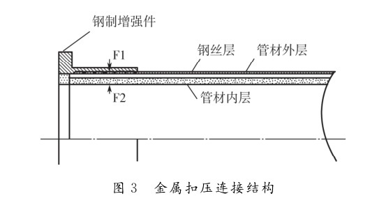 1.6MPa時,通常使用金屬扣壓(yā)連接。在常(cháng)規的金(jīn)屬扣壓(yā)連接中,複合管中鋼絲與鋼製增強件(jiàn)之間的連接,靠的是鋼製增強件與複合管材內壁(bì)之間夾持力F1及F2,如圖3所示。