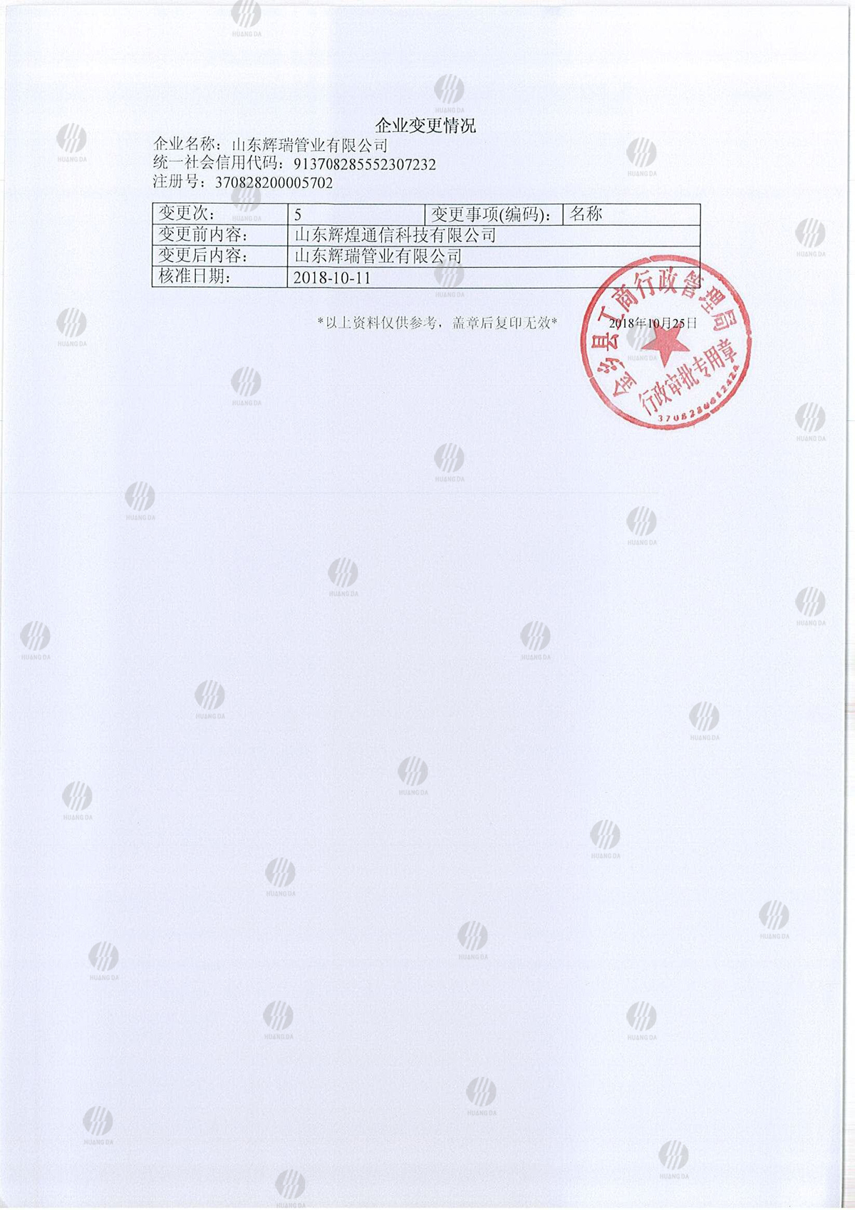 山東輝(huī)煌通信科技有限公司正式更名為山東糖心vlog管業有限(xiàn)公司