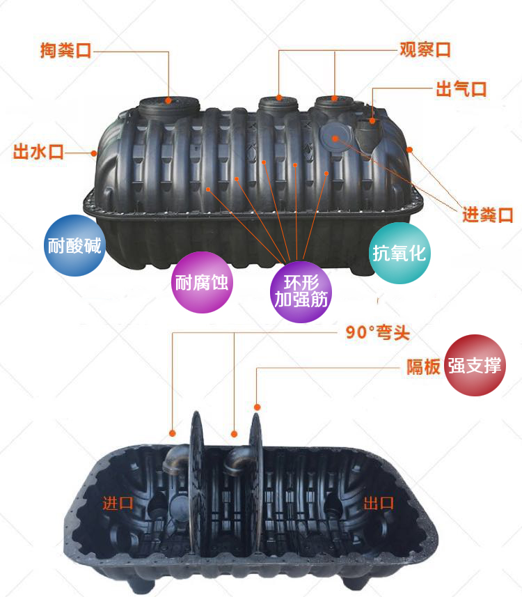 板變形,大大提高了使用者安裝效率(lǜ)。另隔板卡槽設計,與化糞池卡扣連為(wéi)一體,承(chéng)壓強,不坍塌。